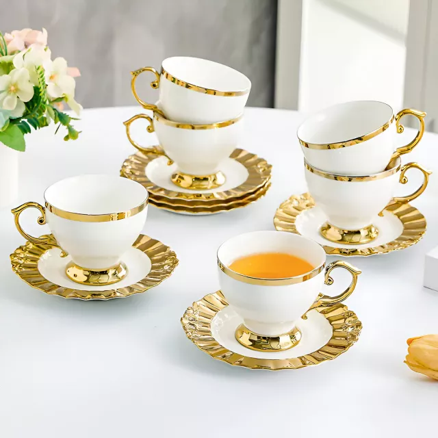 Whether it’s your morning brew, a cozy afternoon latte, or evening milk, make every drink feel luxurious with this gold-trimmed ceramic coffee cup and saucer. Bring a touch of European elegance home today and enjoy a cup that’s as special as you are.