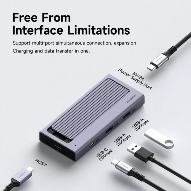This smart enclosure combines the power of a high-speed M.2 NVMe/SATA hard drive case with a 4-in-1 USB-C hub. It expands your connectivity options with two 10Gbps USB-A 3.1 ports, one 10Gbps USB-C 3.1 port, and a 5V/2A power supply port — perfect for connecting external drives, keyboards, flash drives, or charging your devices. It’s ideal for home offices, travel setups, or creative studios where every connection counts.
